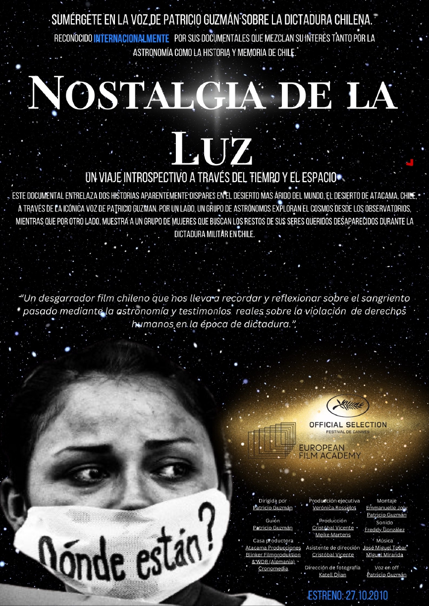 Realiza una investigación profunda sobre el documental "La Nostalgia de la Luz". Comprende su contexto histórico, temas centrales, el estilo del cineasta Patricio Guzmán y la recepción del público.